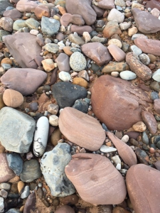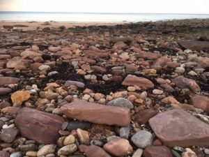Just before we left Colin had spoken about having hard hearts or soft hearts & the importance of having soft hearts, at the Sunday service. A week or so later we were staying at a place called Brora, on the NE coast of Scotland about halfway between Inverness and John O Groats, where Andrew was the GP for many years. There is a fabulous beach – we never did manage to walk the whole length of it. The first evening we were there we were walking along the beautiful sand in the evening light as you can see in the 1st photo. In the distance you can see a spit of land going into the sea. When we got there it actually was an area just covered by stones. Now these were not pebbles easily walked over, neither were they great big boulders. They were indeed beautiful to look at, made up of all shapes and colours & just a bit bigger than our boots. But you know their size made them so difficult to walk on. They were at all angles and balance was so difficult!